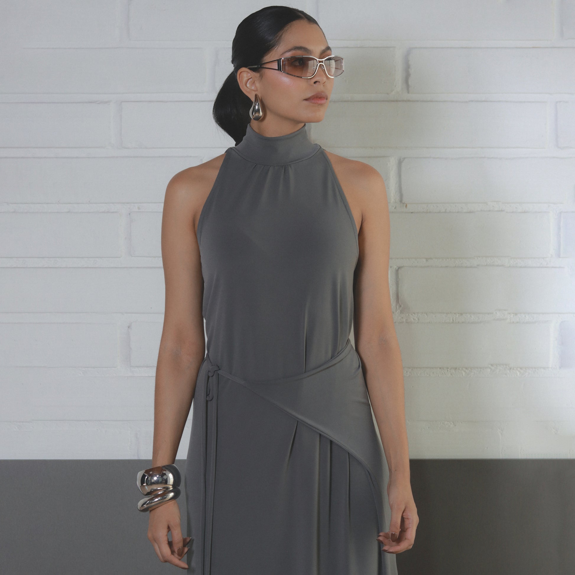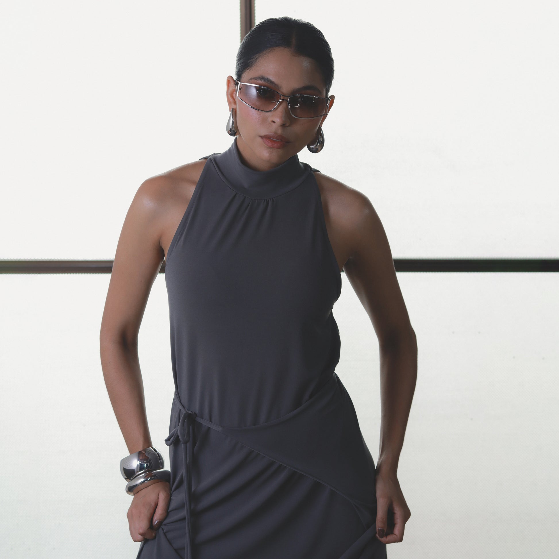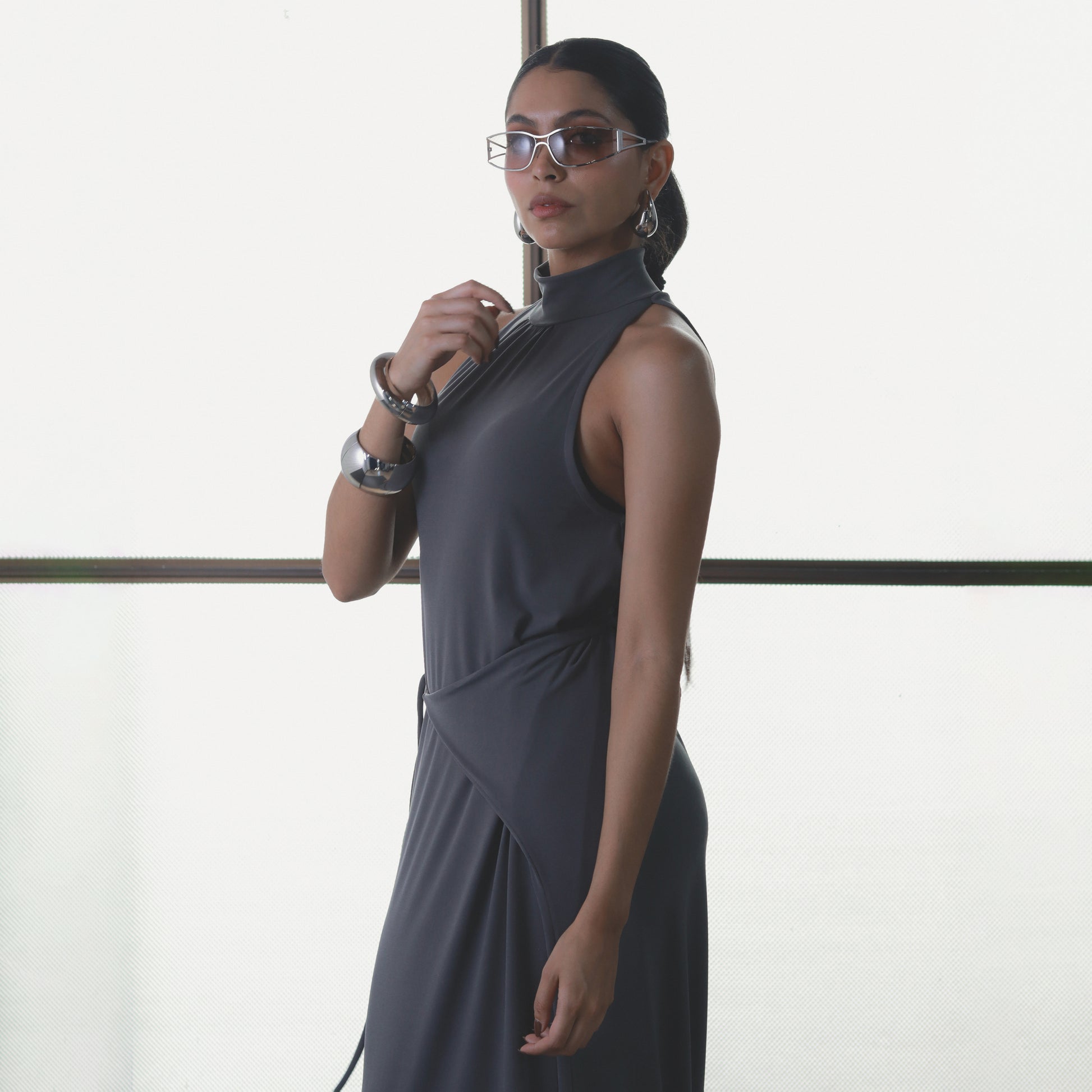 Vestido con un toque de elegancia, hecho en tela lycra que aporta suavidad, elongación y una comodidad que acompaña el movimiento del cuerpo. Su cuello alto suma un aire sofisticado, equilibrando el diseño sin mangas con una estética única. El ajuste en la cintura, graduable y funcional, realza la silueta de forma natural, creando una caída fluida que estiliza la figura y aporta versatilidad al uso; este detalle se convierte en el elemento protagonista del diseño, realzando el vestido y haciéndolo único y diferenciador. Una pieza atemporal y versátil, pensada para destacar la forma, el confort y la fuerza del diseño en una sola prenda.