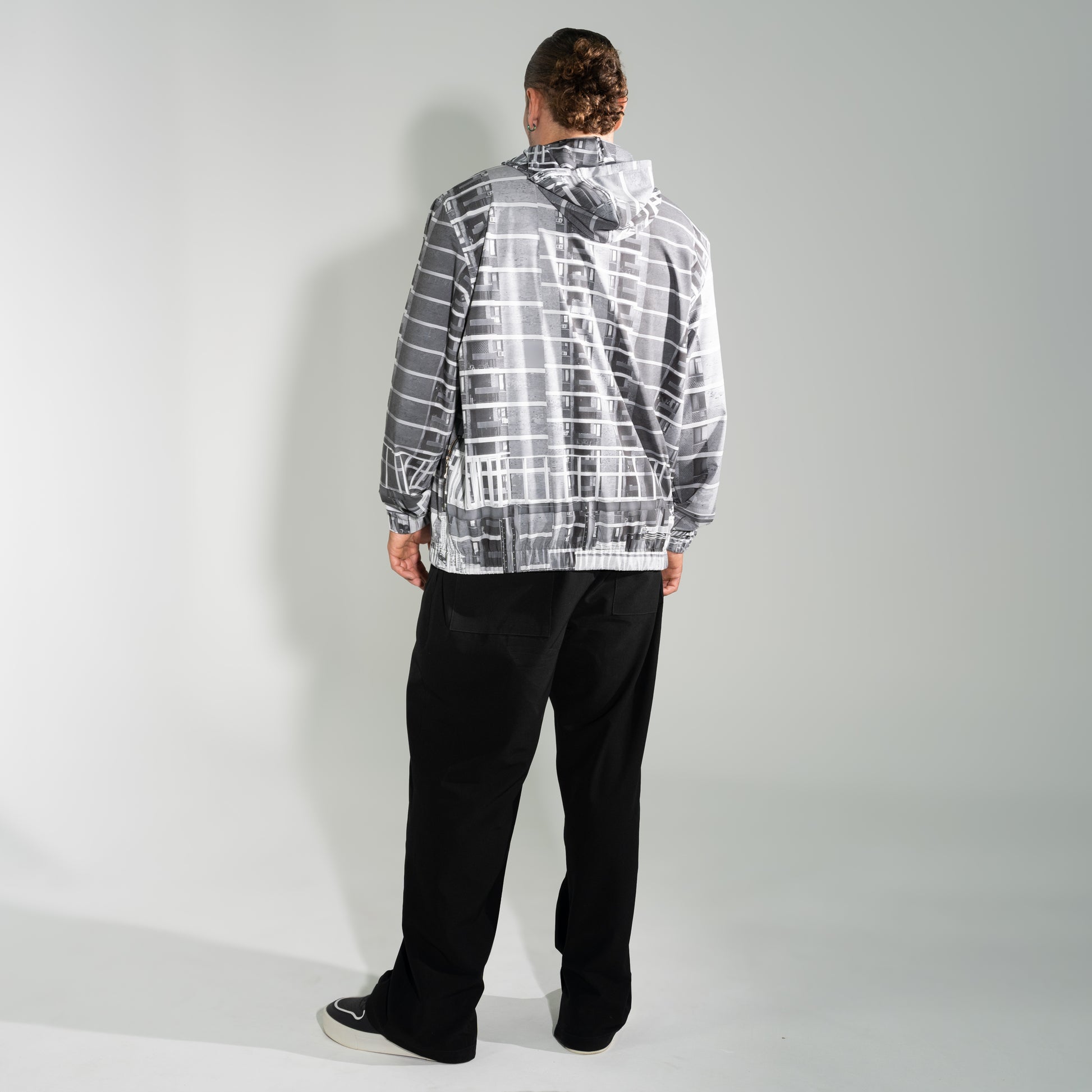 Esta chaqueta oversized destaca por su estampado exclusivo de la marca, inspirado en la arquitectura urbana de Nueva York. La prenda muestra la imagen de un edificio emblemático de la ciudad, con un diseño en escala de grises que le aporta un estilo moderno y urbano. Cuenta con bolsillos laterales con cierre, prácticos y discretos. Incluye capucha ajustable y cierre frontal en el cuello para mayor comodidad. Su pretina y puños llevan elástico, asegurando un ajuste cómodo y funcional. Ideal para quienes buscan un look auténtico y con personalidad en la ciudad. Su tela es antifluido